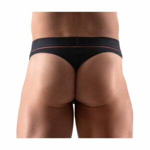 Schwarzer Riostring von Svenjoyment mit rasantem roten Streifen unter dem weichen Webgummibund. Beutel doppellagig gearbeitet. Hoher Tragekomfort dank perfekter Passform und elastischer Organic Cotton Qualität – Oeko-Tex zertifiziert.