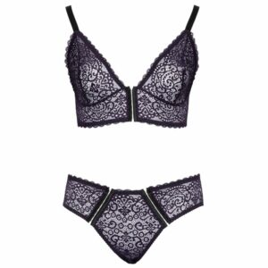 Bralette und Slip im Set von Cottelli CURVES komplett aus feiner lilafarbener Spitze. Rundum weich und elastisch für höchsten Tragekomfort. Bralette mit durchgehender Hakenverschlussleiste zwischen den Cups. Die Träger sind passend verstellbar. Und der Slip präsentiert sich gleich mit 2 Hakenverschlussleisten im Vorderteil, die auch komplett geöffnet werden können.