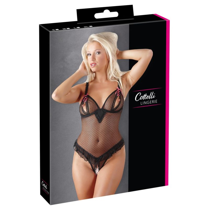 Dieser Body besticht durch offene Bügel-Cups, die mit einer kleinen Satin-Schleife geschnürt werden und durch den offenen Schritt, ebenfalls mit kleinen Satin-Schleifen zu schnüren. Zauberhaft und sexy im 50er-Jahre-Look ist ein kleiner Volant, der die Taille ziert. Träger verstellbar. Hinten Häkchenverschluss. Farbe: Schwarz/Pink.