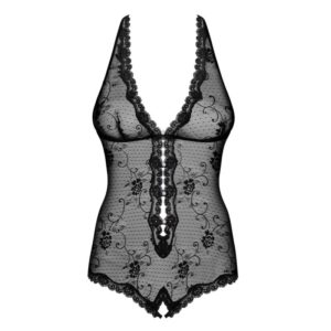 Ganz aus Spitze mit Perlenverzierungen vorne. Offener Schritt bis hinten zum Po. Träger über Kreuz und verstellbar. Perfektes Outfit für aufregende Stunden.