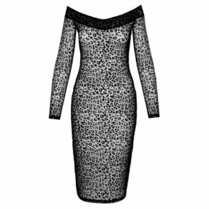 Langarm-Kleid in knieumspielender Länge von Noir. Komplett aus weichem elastischem Powernet mit feinem Samtflockprint im Leoparden-Look. Schulterfreier Carmen-Ausschnitt mit Gummizug für perfekten Halt.