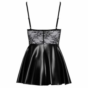 Kurzes Kleid von Noir aus zarter Spitze (Oberteil) im Mix mit Powerwetlook (Rockteil). Rundum weich und elastisch für maximalen Tragekomfort. Hautnahes Spitzen-Oberteil mit Bügel-Cups und Reißverschluss vorne bis zum Rockbund, Rockteil schwingend ausgestellt. Die Träger sind passend verstellbar.