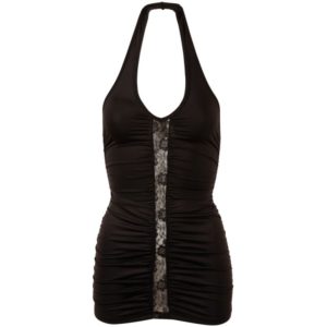 Zartschwarze Transparenz, verspielt feminin. Blütenspitze und viele Raffungen modellieren jede Rundung.
