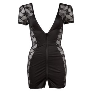 Enges, transparentes Dessouskleid, seitlich aus zarter Spitze. Mit kurzem Arm sowie tiefem Ausschnitt vorne und hinten. Ein 2-Wege-Reißverschluss in der Front macht den sexy Look perfekt.