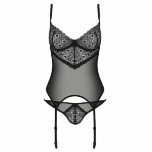 Strapshemd Zinnia Corset aus der Eco Collection von Passion inklusive dazu passendem Riostring. Beides aus elastischem Powernet mit fantasievoller Spitze in den Fronten. Strapshemd mit Bügel-Cups und Hakenverschluss im Rücken. Die Träger und Strumpfhalter sind in der Länge passend verstellbar. Der hübsche Riostring komplettiert dann diesen edlen Transparent-Look.
