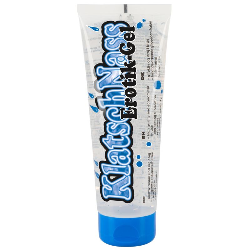 Das extra dickflüssige Erotik-Gel KlatschNass auf Wasserbasis ist angereichert mit feuchtigkeitsspendendem Hyaluron. Es macht das Gel extra geschmeidig und gewährleistet eine lang anhaltende Gleitfähigkeit bei der intensiven (Body-to-Body) Massage. Vegan, öl- und fettfrei. 240 ml.