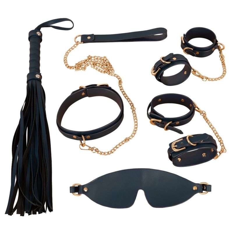 Hochwertiges 6-teiliges Bondage-Set von Bad Kitty in stilechter Lederoptik und in edler Farbgebung: Dunkelblau mit goldfarbenen Metall-Elementen. Bestehend aus 1 Augenmaske, 1 Halsfessel, 1 Leine, 1 Minipeitsche, 1 Handfessel, 1 Fußfessel.