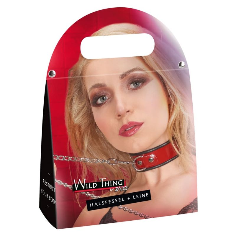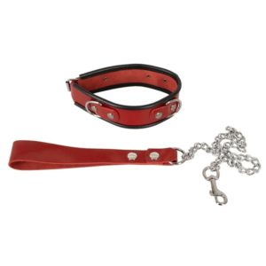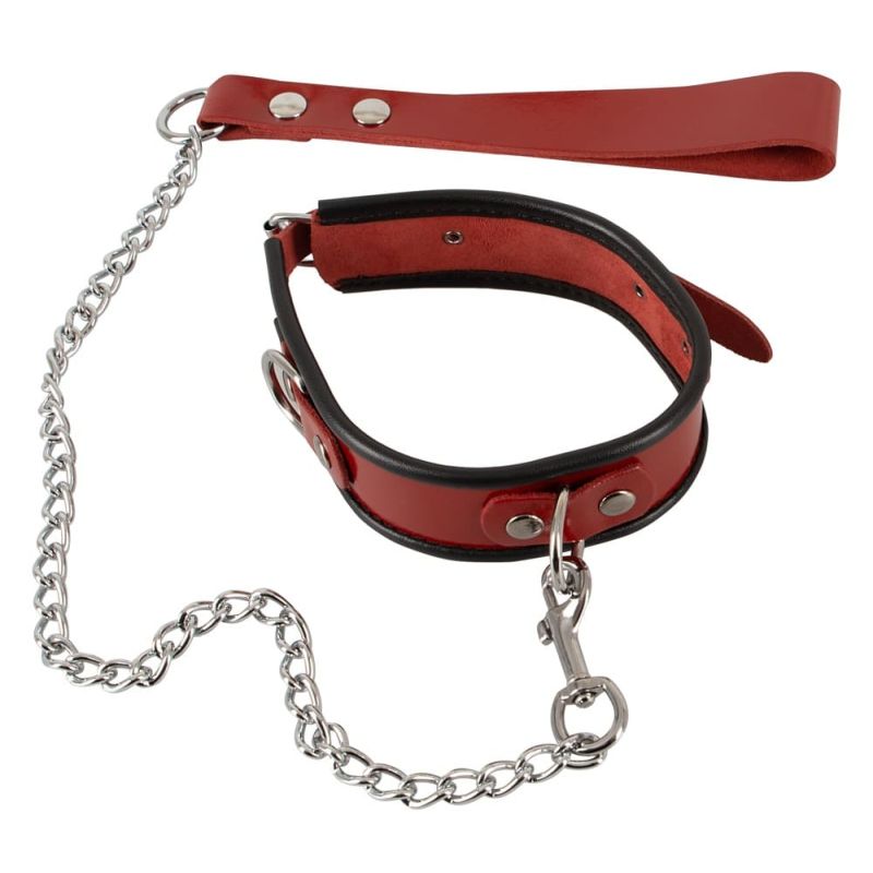 Ungefütterte Halsfessel aus rotem Lackleder, schwarz eingefasst. Vorne und seitlich jeweils ein Ring zum Einhängen der beiliegenden Leine. Mit Schnallenverschluss im Umfang von 34 cm bis 44 cm verstellbar. Kettenleine mit Karabiner und Handschlaufe aus Lackleder 85 cm lang.