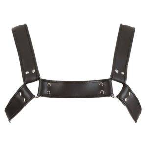 Brustgeschirr aus schwarzen, nietenbesetzten Leder-Riemen und stählernen Verbindungsringen. Mehrfach mit Schnallen-Verschlüssen verstellbar für individuelle Passform.