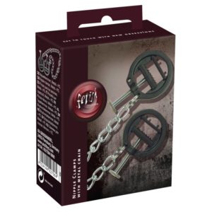 Zwei schwarze, runde Nippel-Schraubzwingen, verbunden mit 33 cm langer, federleichter Metallkette. Druckstärke der Zwingen individuell justierbar.