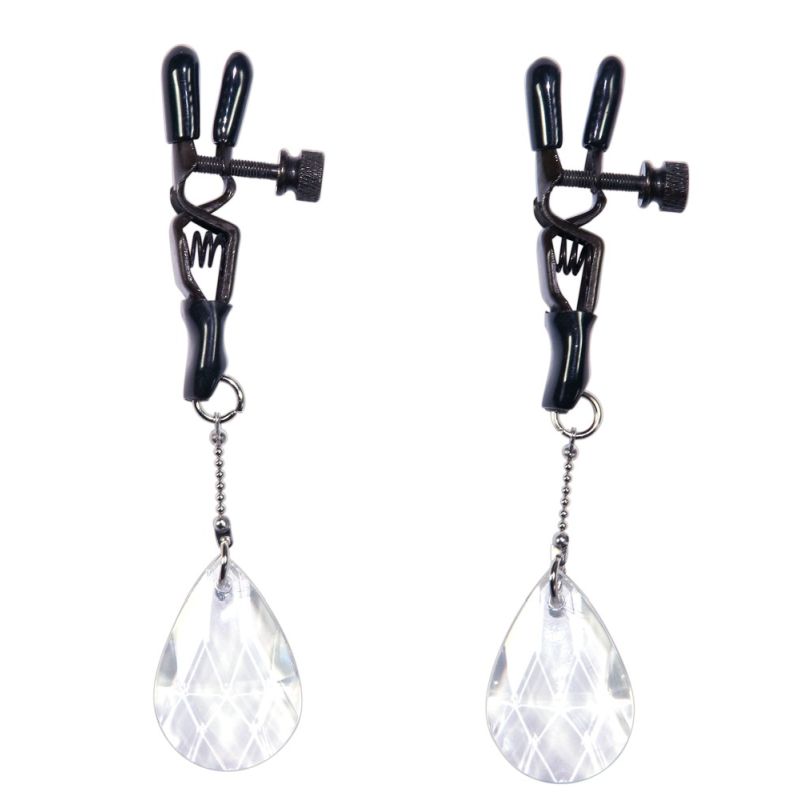 Stellschrauben regulieren die Druckintensität der schwarzen Nippelklemmen von sanft bis hart. Mit mit transparenten Tropfenanhängern. Klemmenlänge ca. 6 cm, Gesamtlänge 11,5 cm. Material: Metall (verchromt), Acryl, PVC. 1 Paar.