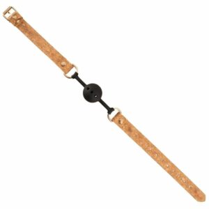 Schwarzer, runder Silikon-Knebel (Ø 4 cm) von Vegan Fetish an Riemen aus natürlichem Kork mit der typischen schönen Optik, die Metall-Elemente sind im goldfarbenen Glanz. Der Korkriemen mit Schnallenverschluss ist im Umfang von 45 cm bis 60 cm verstellbar.