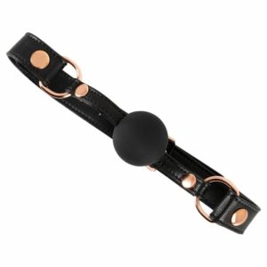 Für Spiele der Lust und Unterwerfung ist dieser Knebel das perfekte Accessoire. Runder bissfester Silikon-Knebelball (Ø 4 cm) an Kopfriemen in hochwertiger Lederoptik mit roségoldfarbenen Metall-Elementen. Innen mit weicher Plüsch-Beschichtung und mit Schnallenverschluss passend verstellbar für ihre/seine Kopfgröße. Schwarz.