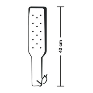 Lilaschwarzes Paddel, das aus mehreren Schichten aufgebaut ist. EIne Seite ist leicht gepolstert, die Kante genäht. Der Griff ist mit Veloursleder umwickelt und geschnürt. 42 x 5 cm (an der breitesten Stelle).