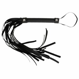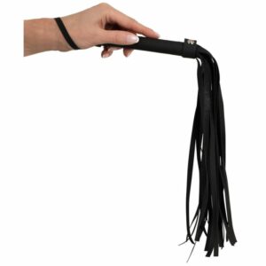 Für zärtlich-schmerzliche Liebeshiebe! Schwarze Peitsche/Flogger mit umwickeltem Griff und praktischer Aufhänge-/Halteschlaufe. Liegt fest und ausgewogen in der Hand, um mit den weichen Riemen zu streicheln oder auch lustvoll zuzuschlagen. Aus hochwertigem Lederimitat (Polyurethan).