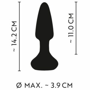 Gesamtlänge 14,2 cm, Einführlänge 11 cm; Ø max. 3,9 cm, Verjüngung-Ø 2 cm. Gewicht 184 g. Silikon, PU, ABS.