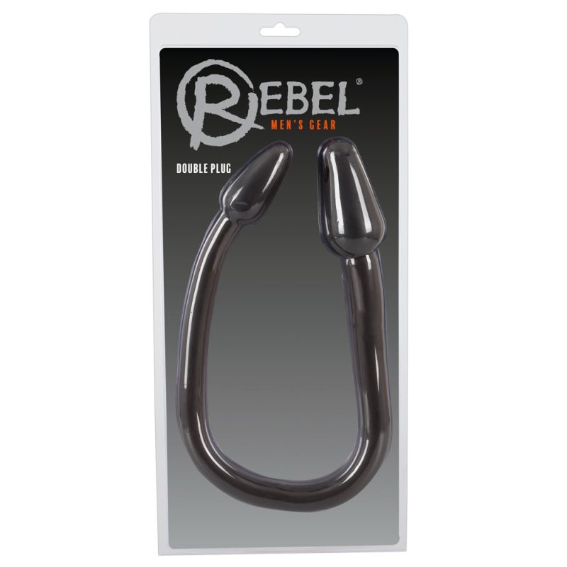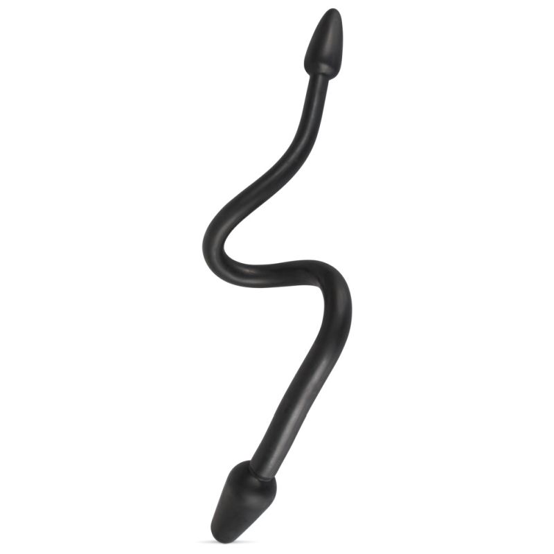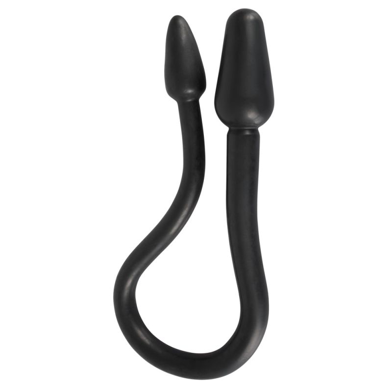 Biegsamer Doppeldildo mit Plug an jedem Ende. Für Solospiele vaginal und zugleich anal einführen, für Spiele zu zweit gönnt sich jede/r einen der Plugs. Schön gleitfreudige Oberfläche. Schwarz.