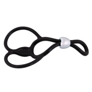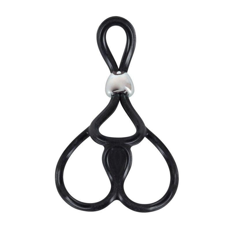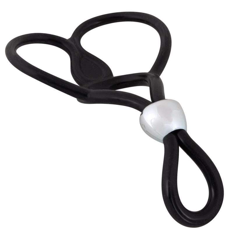 Penisring mit zwei Hodenringen (Ø je ca. 3 cm, dehnbar). Penisring durch Schiebe-Perle individuell verstellbar. Gesamtlänge ca. 13 cm. Schwarz. Silikon, ABS.