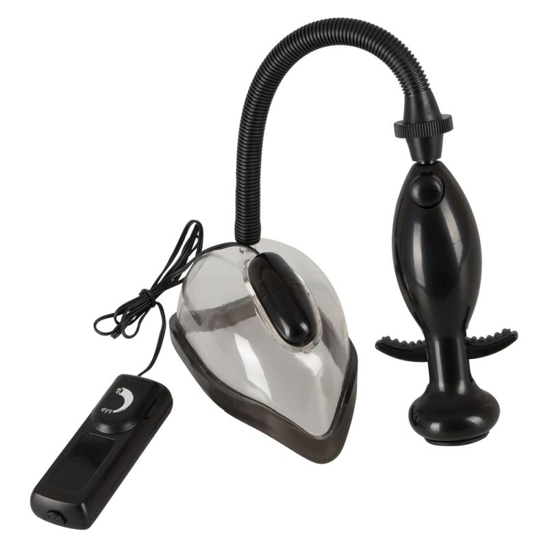 Anatomisch geformte Vagina-Saugschale mit abnehmbarem Vibrobullet und handlicher Zweifingerpumpe. Vibration mit kabelgebundener Fernbedienung stufenlos regelbar und mit Ablassventil. Batterien bitte extra bestellen: 2 x AA.