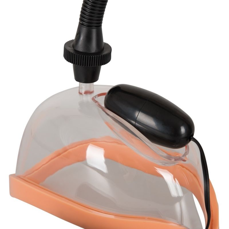 Anatomisch geformte Vagina-Saugschale mit abnehmbarem Vibro-Ei und handlicher Ballpumpe. Vibration mit kabelgebundener Fernbedienung stufenlos regelbar. Innenmaße Saugschale: 12,5 cm lang, 7 cm breit, 5 cm tief. Maße Vibro-Ei: 5,5 cm lang, Ø 2,5 cm. PVC, ABS.