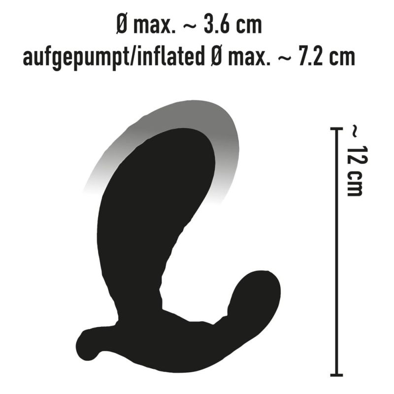 Gesamtlänge 12 cm. Einführlänge 9 cm. Ø 2,2 cm bis 3,6 cm – auf Ø 7,2 cm pumpbar. Silikon, PU, ABS.