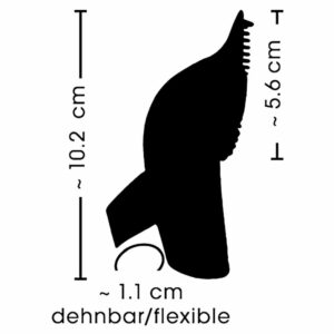 Gesamtlänge 10,2 cm, Noppenfläche 5,6 cm lang, max. 3,2 cm breit, Öffnungs- Ø 1,6 cm; Fingerschlaufen- Ø 1,1 cm (dehnbar). Gewicht 59 g.