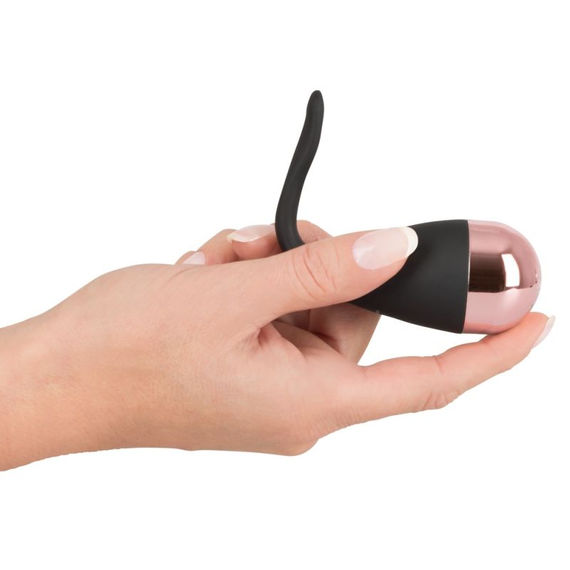 Vibro-Ei: Gesamtlänge 8,5 cm, Einführtiefe 7,5 cm, Ø max. 3,6 cm. Klitorisreizarm: Gesamtlänge 4,9 cm, Ø 0,9-1,4 cm. Silikonkissen: 3,8 cm lang, 2,5 cm breit. ABS mit PU-Beschichtung, ABS mit Metallic-Überzug, Silikon mit PU-Beschichtung.